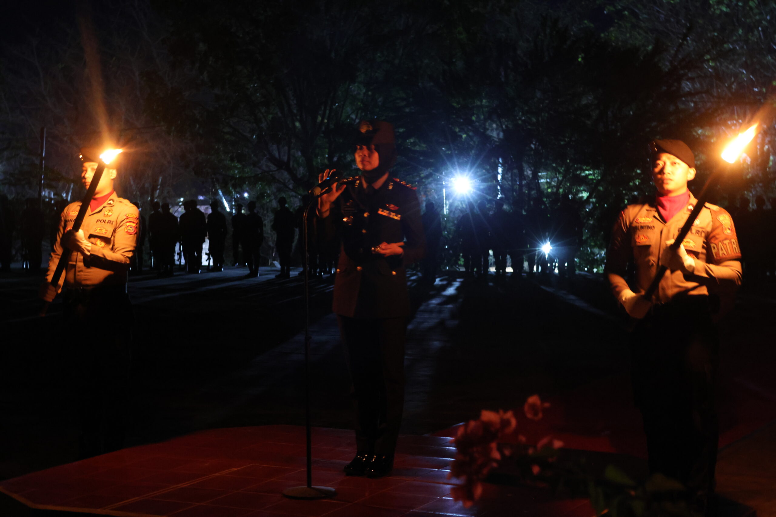 Dalam suasana yang hening dan penuh penghayatan, seluruh peserta upacara berdiri tegak, merenungi perjuangan para pahlawan yang telah mengorbankan jiwa dan raga demi kemerdekaan bangsa. Lilin-lilin obor yang menyala di tengah kegelapan malam menjadi simbol penerang semangat juang yang tak pernah padam.