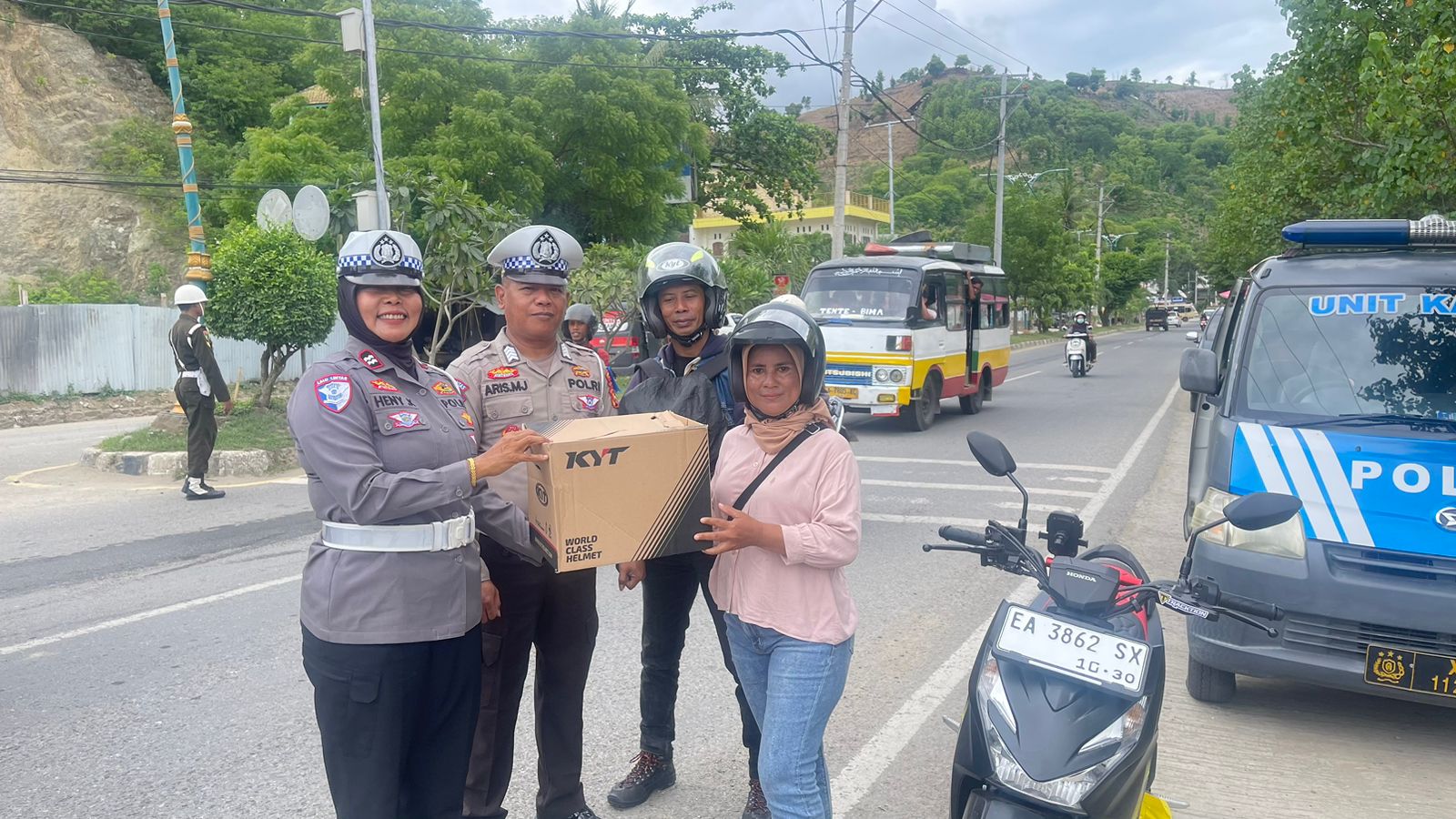 Kota Bima, NTB (24 November 2025) – Satuan Lalu Lintas Polres Bima Kota melaksanakan Operasi Zebra Rinjani 2025 yang dirangkaikan dengan kegiatan simpatik berupa pembagian helm gratis, beras, serta penempelan stiker keselamatan berlalu lintas kepada para pengendara.