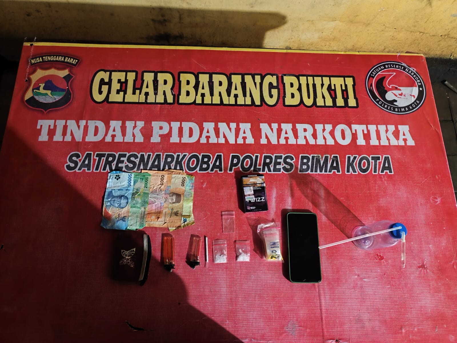 Dalam penggeledahan, petugas berhasil mengamankan sejumlah barang bukti berupa satu buah alat hisap (bong), satu plastik klip berisi sabu, satu pipet plastik berisi sabu, dua buah korek api, satu dompet warna cokelat, satu sendok pipet rakitan, uang tunai sebesar Rp117.000, satu unit handphone, serta satu bungkus rokok merek Twizz.
