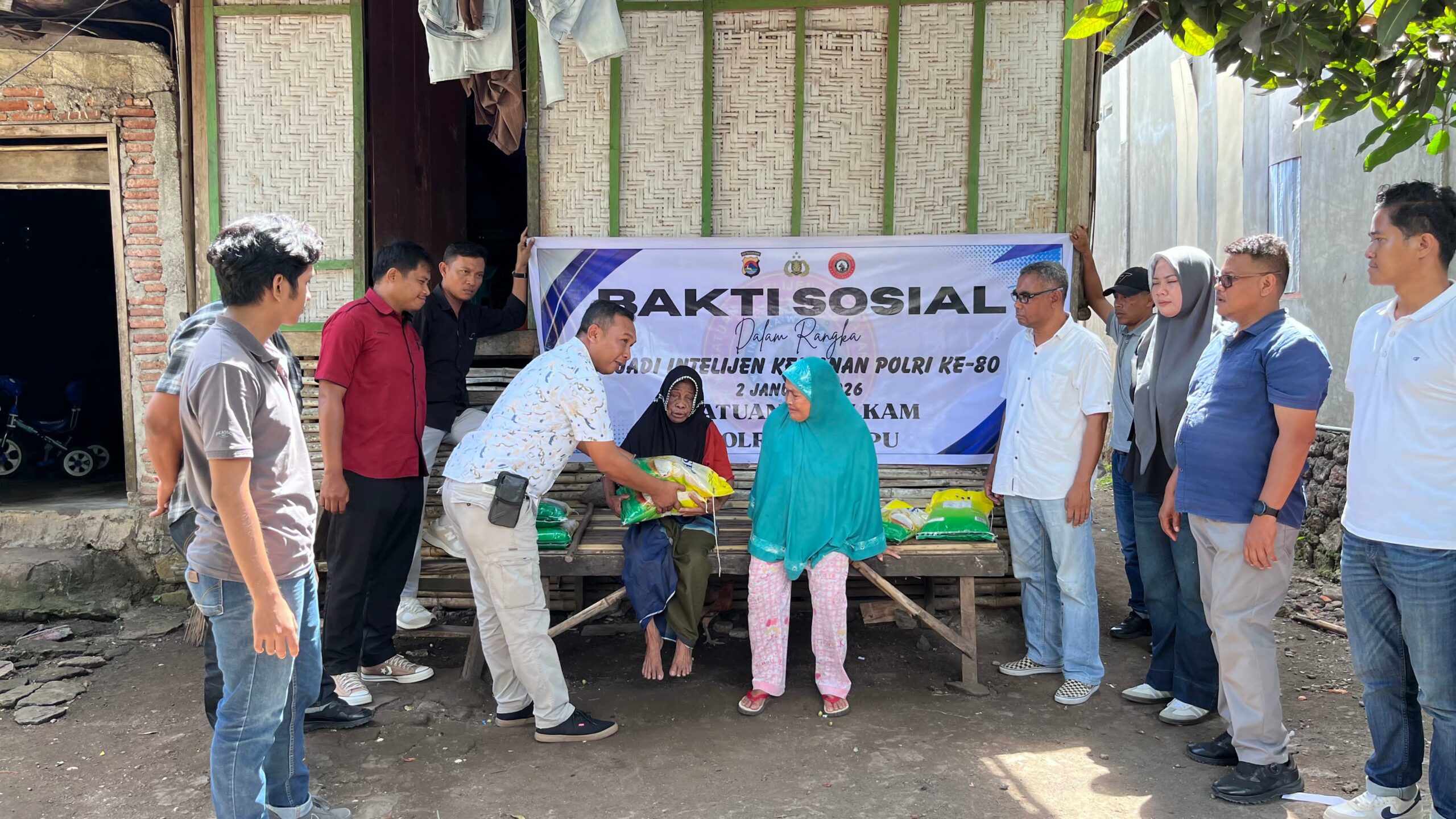 Dalam rangka memperingati Hari Jadi Intelijen Keamanan Polri ke-80, Satuan Intelkam Polres Dompu melaksanakan kegiatan bakti sosial berupa pembagian bantuan beras kepada masyarakat kurang mampu di Desa Mumbu, Kecamatan Woja, Kabupaten Dompu, Sabtu (3/1/2026).