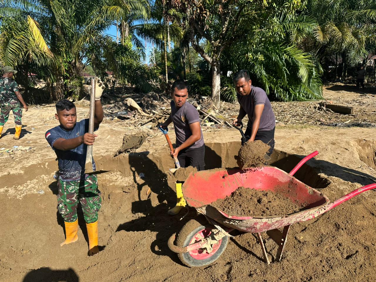 Hingga siang hari, progres pekerjaan menunjukkan hasil yang signifikan. Pembersihan rumah warga atas nama Bapak Rinto Harahap telah mencapai sekitar 40 persen, dengan material tanah yang menimbun bagian dalam rumah dimanfaatkan sebagai dasar lantai. Sementara itu, penggalian sumur umum dan pembuatan ball tank air telah mencapai 95 persen, dan pembangunan MCK Masjid At-Taqwa Muhammadiyah mencapai sekitar 60 persen, yang seluruhnya akan dilanjutkan pada tahap berikutnya.