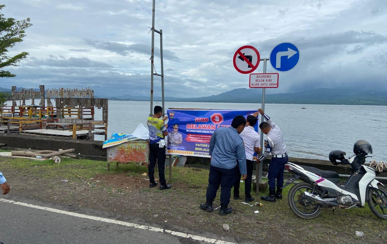 Guna mencegah terjadinya kecelakaan Lalu lintas di jalan raya, Satlantas Polres Bima Polda NTB melakukan pemasangan spanduk himbauan larangan melawan arus disejumlah lokasi rawan kecelakaan lalu lintas (Lakalantas).